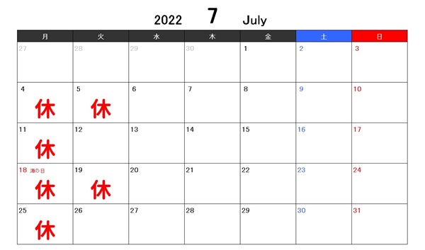 いよいよ7月!お休みのお知らせです。