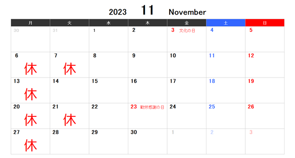 ウィル11月のお休みのお知らせ 当店の11月のお休みは以下の通りになります。 ご確認宜しくお願い致します。 いよいよ今年も残り2か月になりました。 ここから一気に寒くなるのでしょうか? 体調にはくれぐれもお気をつけください。 年末は込み合う事も予想されますので、お早目のご予約をお願いいたします。 ウィルスタッフ一同