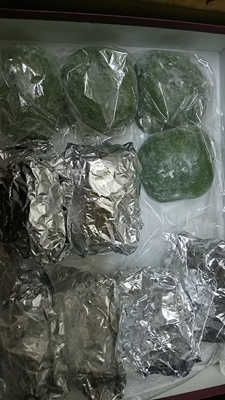 丹後のお客様 わざわざ京都の丹後からご来店いただく お客様がまた采女の大好物を持ってきていただきました。 15個の草餅(しかも手作り!) 冷凍にした方が良いとのことで アルミとラップで包んでいます。 昆布やタケノコの総菜も頂きました。