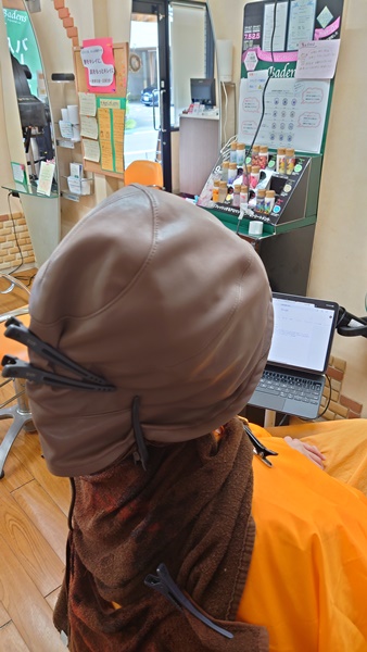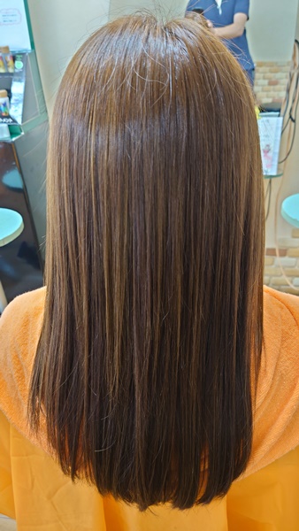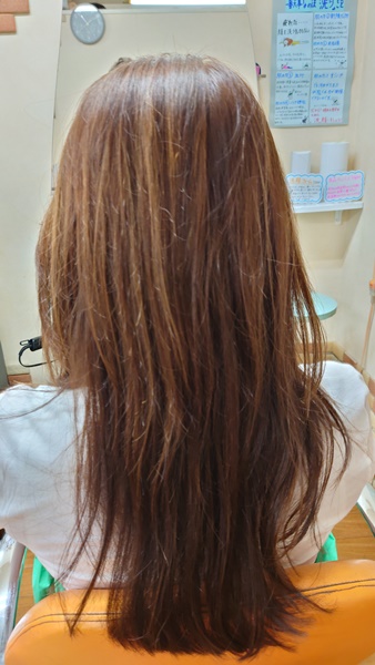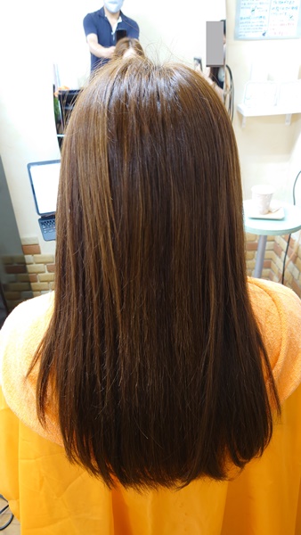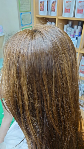 ⇧シャンプー後、コメ発酵エキスのトリートメントをたっぷりと塗布し、完全ドライにした状態です。