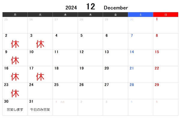 12月ウィルのお休み 2024年12月のお休みです。 30日(月)は営業いたします。 31日は午前のみの営業となりますが、予約で埋まってしまいました。 お早目のご予約をお願いいたします。 ウィル スタッフ