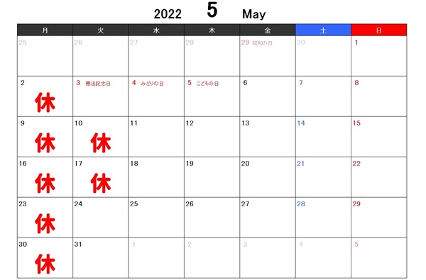 当初3日をお休みとアナウンスさせて頂いておりましたが、諸事情により5月は10日の第二火曜日をお休みとさせて頂きます。