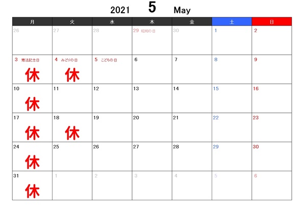5月のお休みをお知らせします。