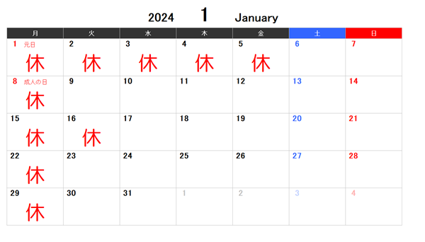 2024年1月のお休み いよいよ2023年も残り4日となりました。 何かと忙しい年末ですが、健やかに明年を迎えられるようお願いいたします。 2024年1月の休みは以下の通りになります。 ご来店の際にはご参考にしてください。